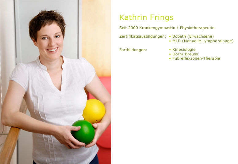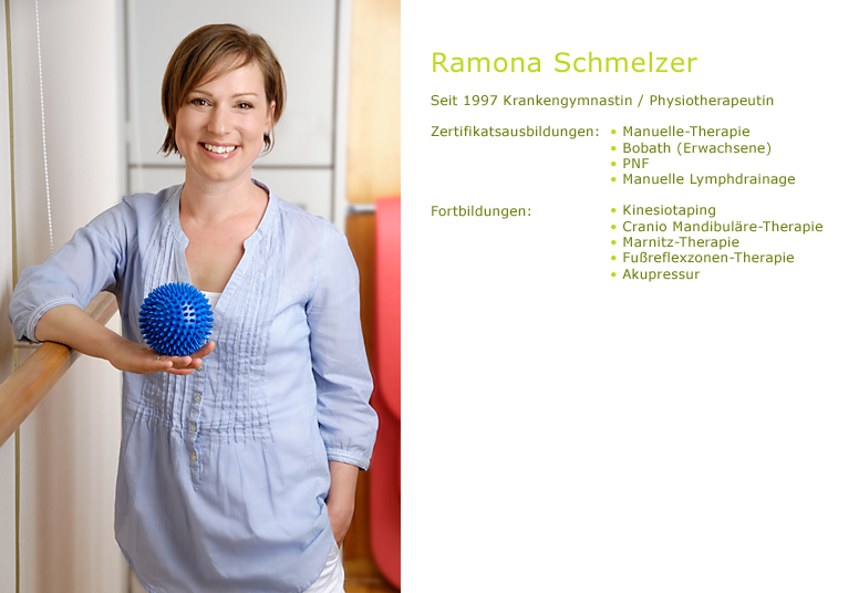 | Fortbildungen: | • Sensorische Integration • Cranio-Sacral Therapie • Manuelle-Therapie • Pörnbacher Konzept • Progressive Muskelrelaxation nach Jacobson |